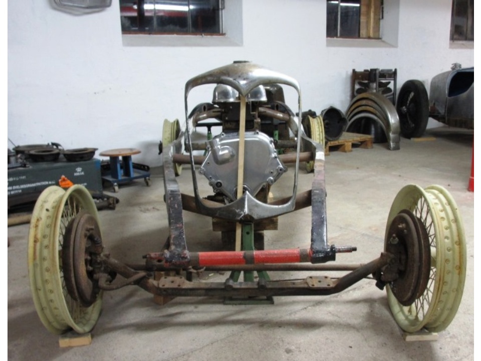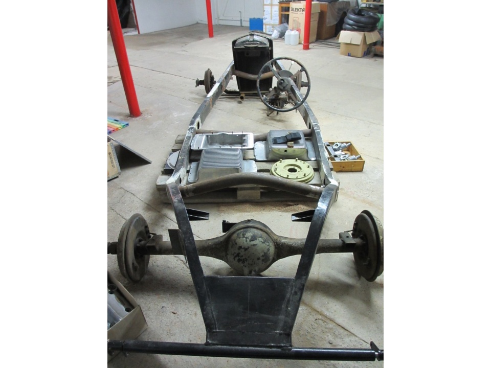 weitere Informationen/more infos | A Riley special project, consisting of an original Riley 9 Merlin chassis with narrowed rear end and overslung. The axles are both Riley 9 and so is the steering column. The rear axles har been change to run a conventional prop shaft and RM diff. Brakes also Riley 9, mechanical with rods. I have two RM 1.5L engines and 3 RM gearboxes for it but they need overhauling. I have various other pieces for it and one complet original radiator with masking and one cut down masking. I havent decided yet completly on how to build it. It could possibly be for sale. |