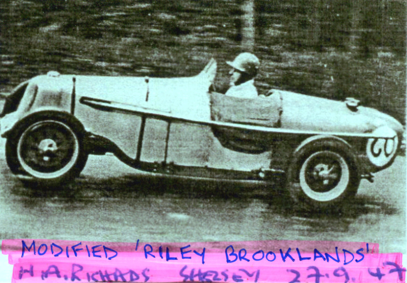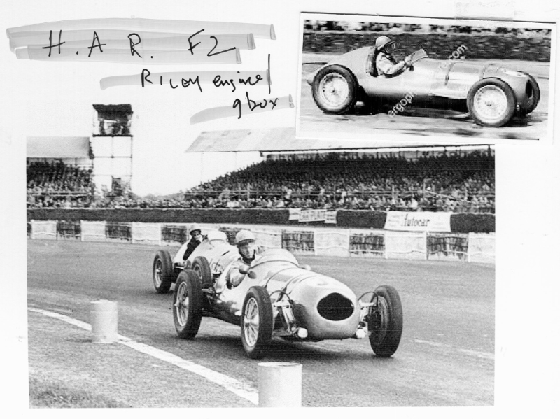and adjustable torsion bars inside the chassis main-tubes. Rack and pinion steering. Magnesium alloy brake-drums. HAR alloy differential-casing, Riley internals with stepped-down horizontal spur-gearing on differential-nose to lower transmission line and seat-height. Riley c/r gearbox. The first of five chassis-frames made - other engines used inculde E.R.A. and Bugatti 3300cc HORACE RICHARDS AND THE H.A.R. - SOME NOTES Many members will remember the electrifying performances put up by a very fast Brooklands in the hands of Peter Binns and (before Peter had the car) when it was driven by Austen Nurse. 'What one tends to forget, however, is that (earlier still) the car had been breathed on by Horace Richards who had himself competed with it-not without success. Horace ran a garage in Birmingham, and devoted a considerable amount of time and energy to various aspects of motor sport. In 1952—spurred on, no doubt, by his campaign with the Brooklands—he produced an entirely new car for the then " Formula 2" calling it by his initials—"H.A.R." In the 'Racing Car Pocket Book' Denis Jenkinson wrote: "Horace Richards built his own tubular chassis, with independent suspension to all four wheels, and installed the 2 litre Riley engine for 1952/3 Formula 2 racing. A nicely made:, and well proportioned car ..." The opinion expressed in the last sentence is heartily endorsed by the Editor who can remember Horace performing with the car at Goodwood. In March, 1952, The Autocar featured this car in its series "Interesting Competition Cars," and in their article they gave technical details as follows. " The frame is a welded tubular structure consisting of two perfectly straight chrome molybdenum steel tubes, 3in. in diameter and 17-gauge, lying parallel with their centre's about 2ft. apart, and braced laterally by three main cross members. These are tubes of the same diameter as the longitudinals, strategically placed to take care of the torsional loads imposed by the front and rear suspension. The centre one is bowed slightly downwards and supports the rear of the power unit. In addition there are two two-inch cross tubes, one each at the extreme ends to carry the radiator block and tail fuel tank. Sheet metal box section pedestals are built up on each side at front and rear to provide a mounting point for the upper suspension arms, the same method being used for the forward engine bearers, which are designed to accommodate three alternative engine units. The frame weighs only 801b. Independent suspension at both front and rear is through unequal length wishbones controlled by Salter laminated-blade torsion bars. Levers on the ends of these are connected by links to levers of the same length formed integrally with the light alloy lower wishbones, which pivot on their own bearings on the frame. The torsion bars lie inside the main frame tubes and the abutment at their fixed ends is adjustable for trimming the level of the car. Girling piston-type dampers form the pivot point of the shorter upper wishbones. This much of the system is common to each wheel, the outer ends of the wishbones at the front being connected by forgings, machined all over and polished, which carry separate kingpins upon which pivot standard Riley stub axles. Riley rear hubs are bolted to light alloy carriers whose central bosses house additional bearings for the short axle shafts. Modified Girling hydraulic brakes having magnesium alloy shoes carried on similar back plates operate in centrifugally cast iron liners in magnesium alloy drums, the hand brake being mechanically operated and separate from the hydraulic system. The tunnel of the rack and pinion steering gear is mounted on brackets welded to the front main cross tube, and the column has two rubber-enclosed universal joints which give clearance for any of the three available engines. The ratio gives 2;I: turns from lock to lock. Universally jointed half-shafts transmit the drive to each rear wheel from a plain differential housed in an Elektron casing having integrally cast transverse arms which bolt on to faces welded to the frame tubes. On the front of the Elektron nosepiece a separate housing contains a pair of spur gears disposed one above the other so that the transmission line and seat level are lowered considerably. By transposing various gears in this housing, six different final drive ratios are available. Between this assembly and the tail of the gear box is a short universally jointed propeller shaft running in a sheet metal tunnel, the mountings for which, to guard against trouble in the event of failure of the shaft completely encircle both ends. In order to upset as little as possible the weight distribution of the car, which is approximately 50-50, the total fuel stowage is carried in three welded light alloy tanks, 17 gallons in the tail and 71 gallons in each wing tank on either side of the driving seat. An entirely separate feed allows fuel to be used first from the tail tank. Each tank has its light alloy quick-action filler cap and blow-off valves set to 21 lb. A hand operated pump supplies the pressure. Made of Duralumin in two main portions, scuttle and tail, the body has extremely pleasing contours formed over its steel tube frame, and is readily demountable from the chassis. The hoops of the framework terminate in small feet which bolt on to light sheet brackets welded to the chassis tubes. Louvered fairings flank the one-piece bonnet panel, which is secured by stout spring-loaded straps recessed to lie flush with the surface. A nose cowling and a full-length undertray complete the body parts, though additional fairing are contemplated over those parts of the suspension left exposed at present. A fixed screen of Perspex is flanked by twin rear view mirrors. Instruments are reduced to a rev counter, oil and air pressure and oil and water temperature gauges. Centre-lock wheels are shod with 5.00-17in. tyres at the front and 5.25- 18in. rear; the