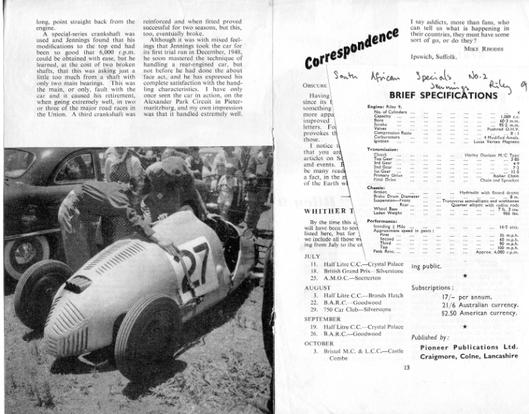 Parow Hillclimb, 1950 - record holder 2 years Alexander Park, Pietermarutzburg, 1951 Killarney, April 1951 All SOUTH AFRICAN events |