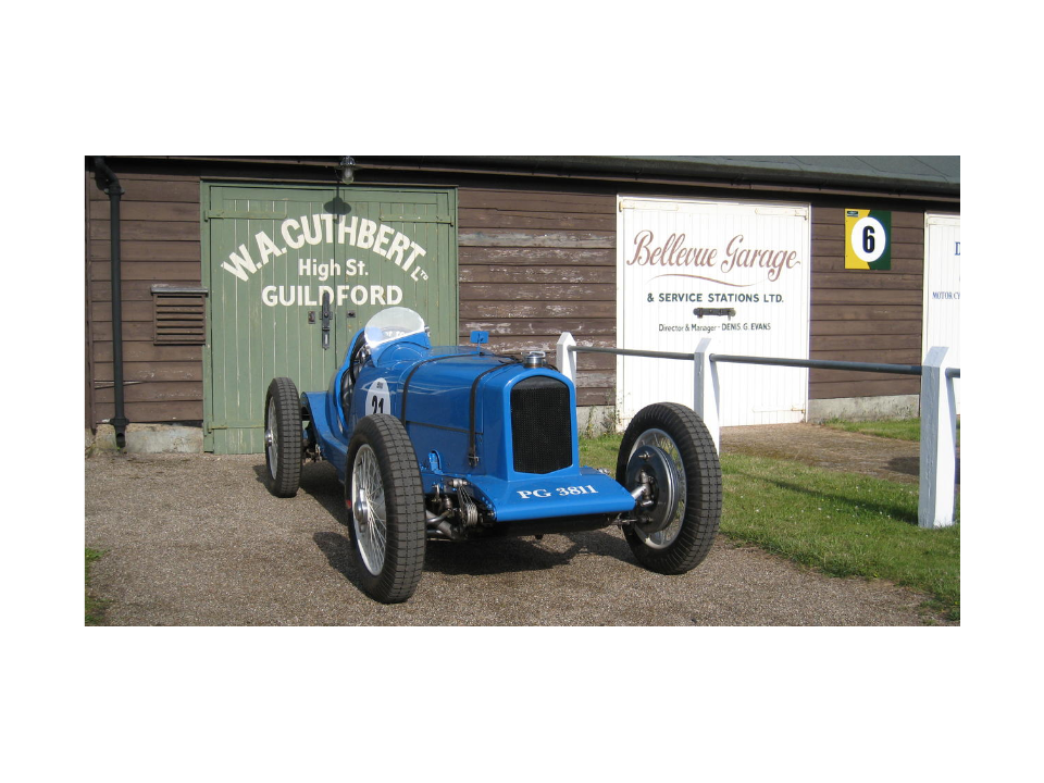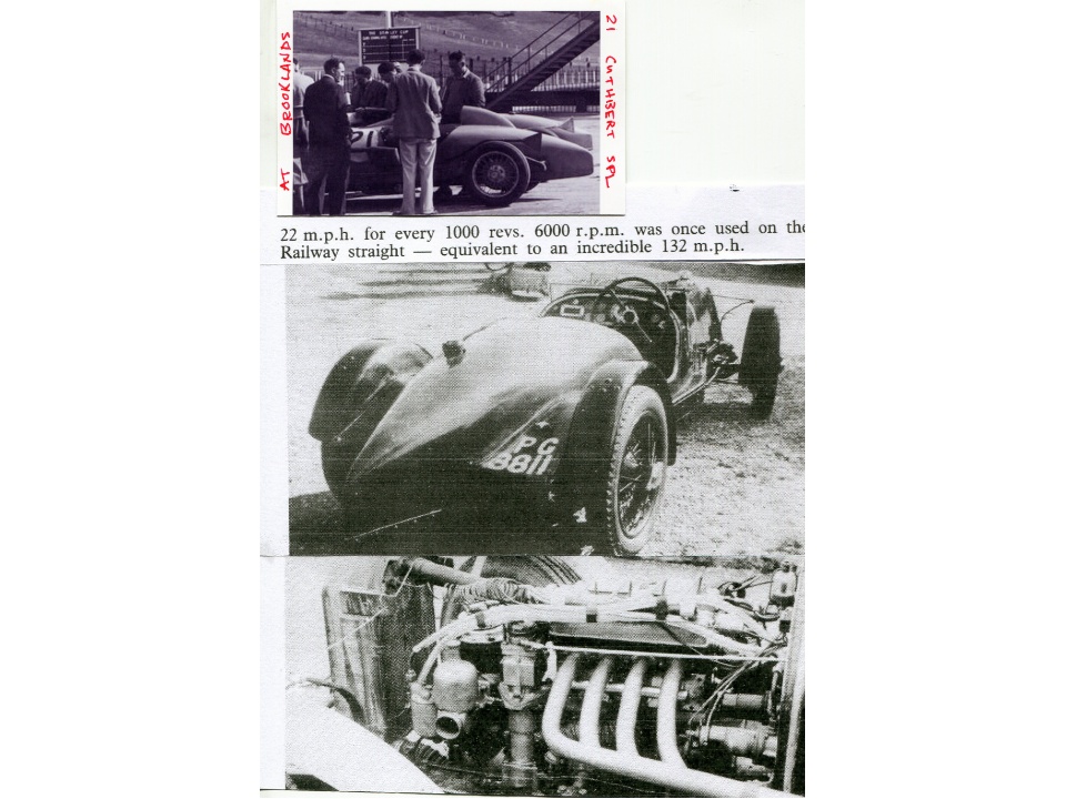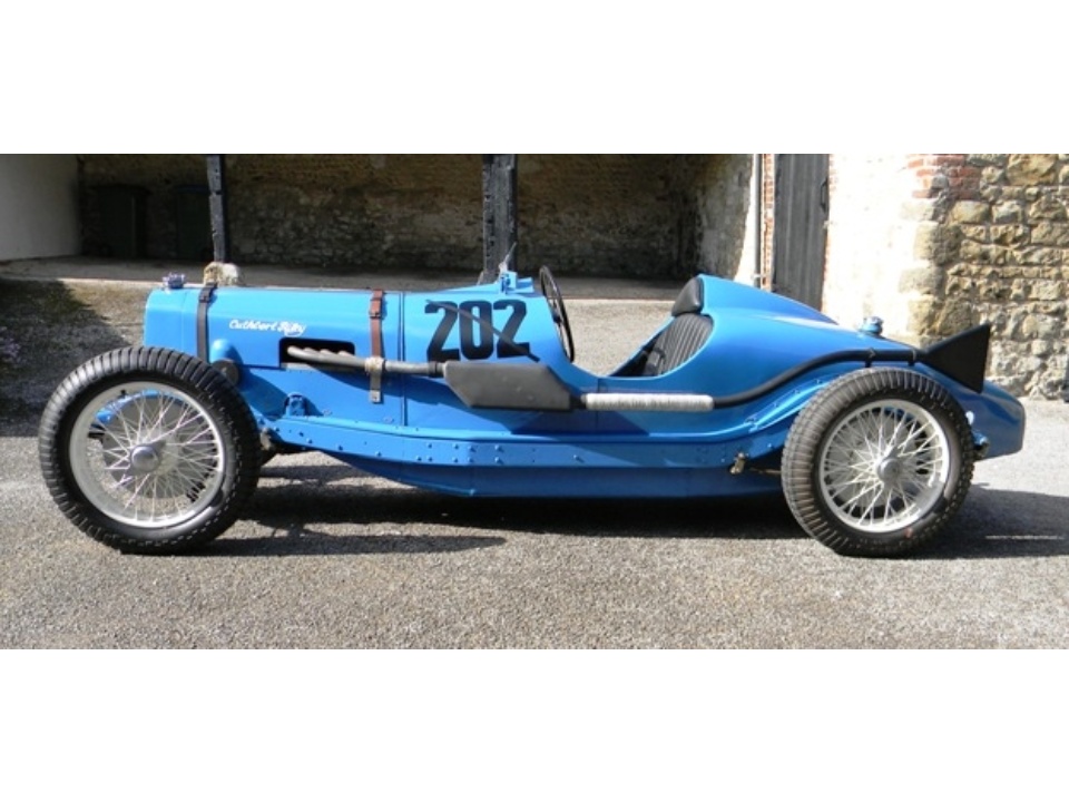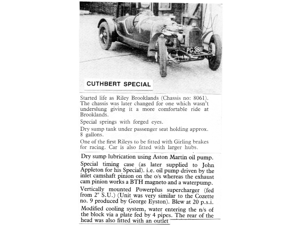The car's best result was in the 1932 BRDC 500 when Cuthbert and Capt. C.W. Fiennes finished fourth overall at an average speed of 97.41mph, despite losing 14 minutes in the pits with fuel feed problems. The car won the Yorkshire Junior Short handicap at the 1932 Autumn BARC meeting with an average speed of 93.32mph and a fastest lap at 100.61mph. In 1933, the car was extensively modified and a Powerplus supercharger was fitted. Cuthbert designed a new timing case cover and modified the water cooling. R.J. Appleton used these modified castings as patterns for the Appleton Riley. After a spectacular blow-up in the 1933 BRDC 500 mile race, Cuthbert converted the car to a dry-sump oil system and fitted an Aston Martin oil and scavenge pump which fed from a large tank under the driver's seat. This is no longer on the car but is included in the sale. The engine ran with 17psi of boost at 5,900rpm and reached speeds of 130mph. The car also had the prototype Girling rod brake system. In its present form, the car first raced in the Light Car Club Relay Race (number 1A) on 22nd July 1933, but did not finish. The July edition of Autocar reported that "….the car, although very fast and shaping well, was too new for a serious test." The car competed in several Brooklands races in 1934 and 1935. Post-war, it was campaigned at Goodwood during the 1950's, driven by Ian Strickland and later by Roy Whitehouse at Silverstone. Eventually the car joined the Majzub collection and was raced at Donington Park in 1991. The present owner bought the car in 2005 and has entered it in various VSCC events and Brooklands celebrations. This Riley 9HP is registered for the road and is supplied with a V5C registration document, old log books and old MoT test certificates. An extensive history file accompanies the car which includes letters from W.A. Cuthbert and Arthur Kingston (who helped build the car) as well as several previous owners and many photographs showing the car during its long racing life. This represents a piece of living Brooklands history which would be welcomed at any historic racing event. |