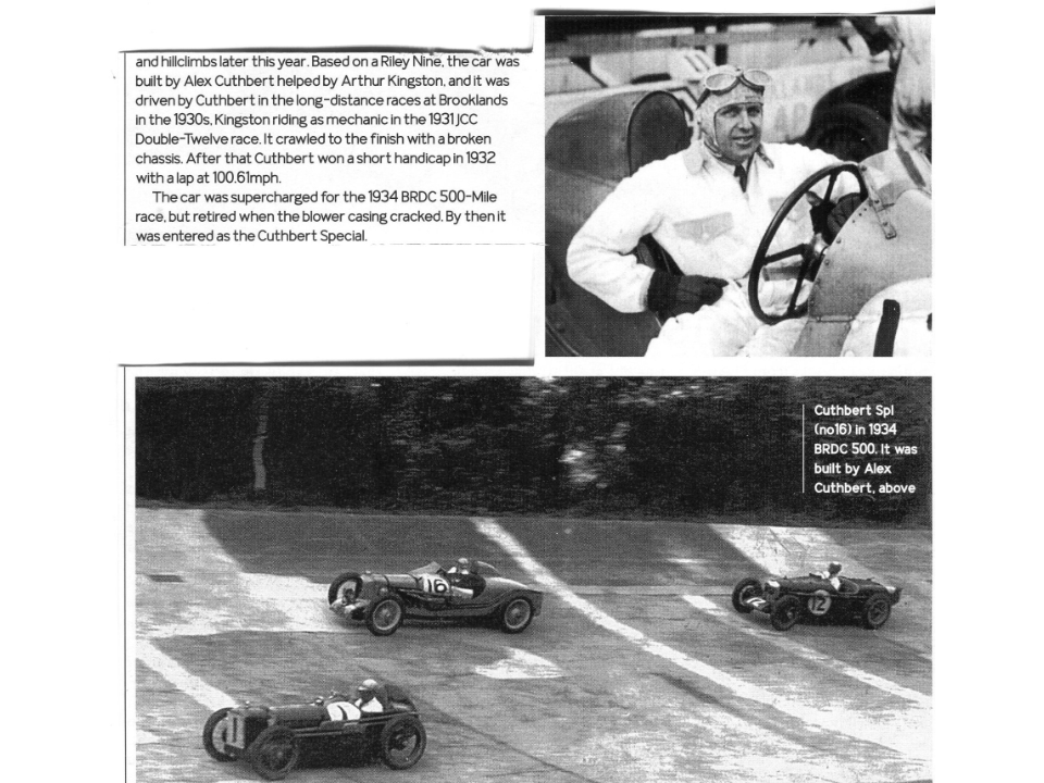Alex Cuthbert was a successful works driver for the Riley team during the late 1920's and 1930's and was friends with Raymond Mays, the founder of ERA. Cuthbert ran a garage and tuning business in Guildford which is honoured at the Brooklands Museum by having one of the garage doors painted in his racing colours. Cuthbert acquired the Brooklands Riley VC8306 which had won the 1100cc class at the 1931 German Grand Prix; he drove this car in the 1931 BRDC 500 mile race at Brooklands as a member of the Riley works team. He didn't like the way that the car handled the Brooklands bumps so decided to transfer the works engine and gearbox to a standard nine chassis and because he preferred the way the longer chassis rode, this was the basis of the Cuthbert Special. The car was fitted with a body with a full length under tray and a pointed tail. The body was split at the scuttle to allow it to flex on the notoriously bumpy Brooklands track.