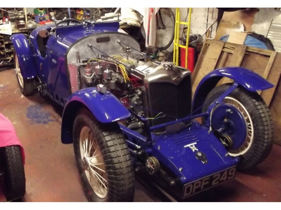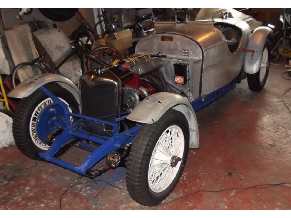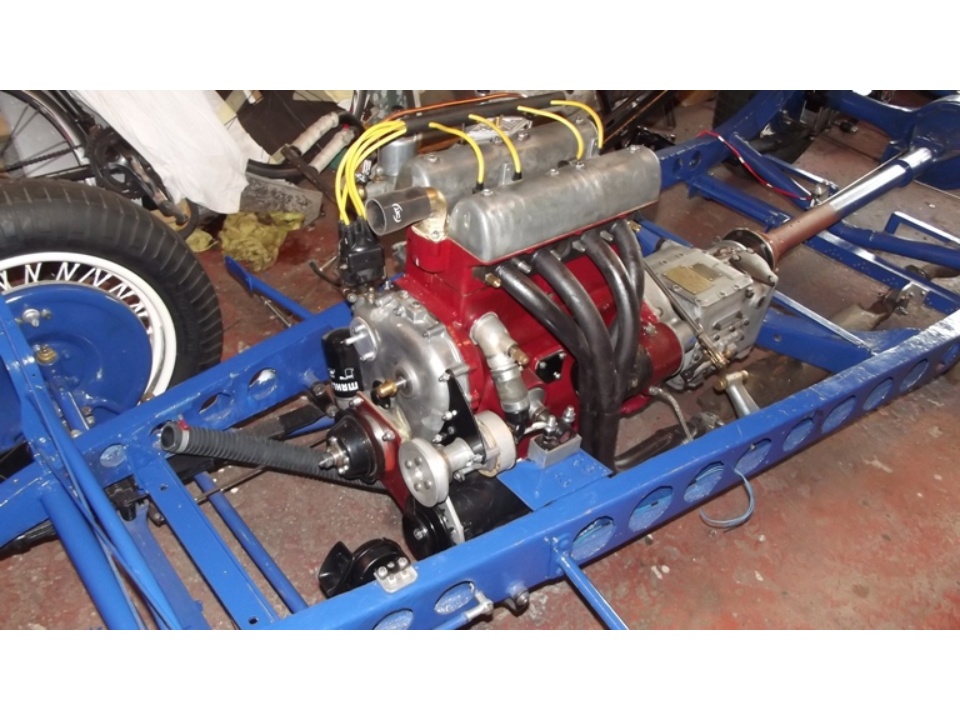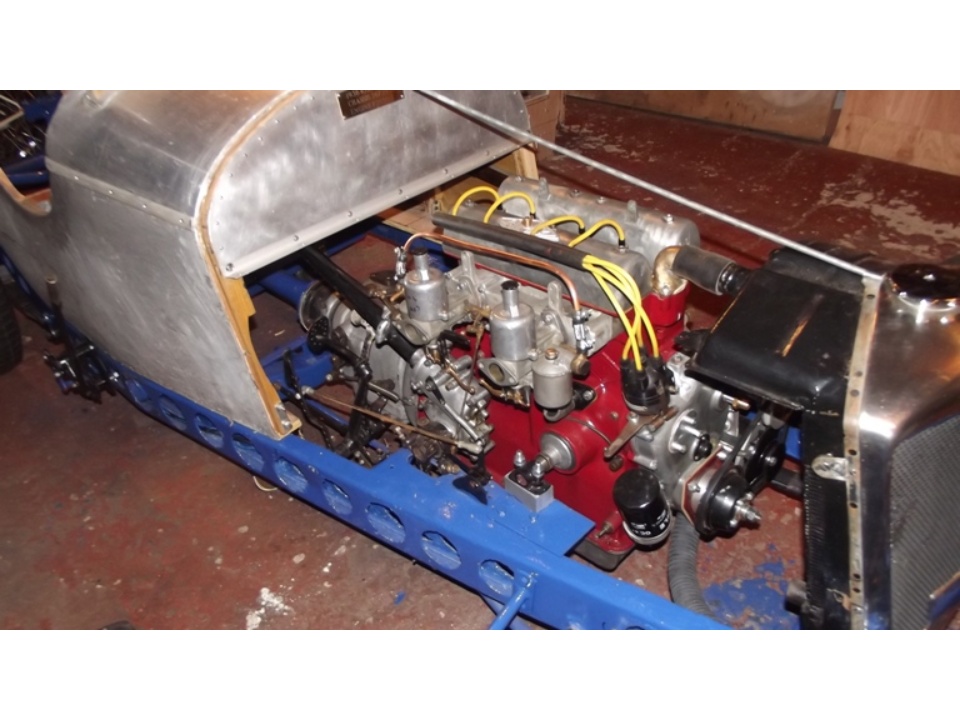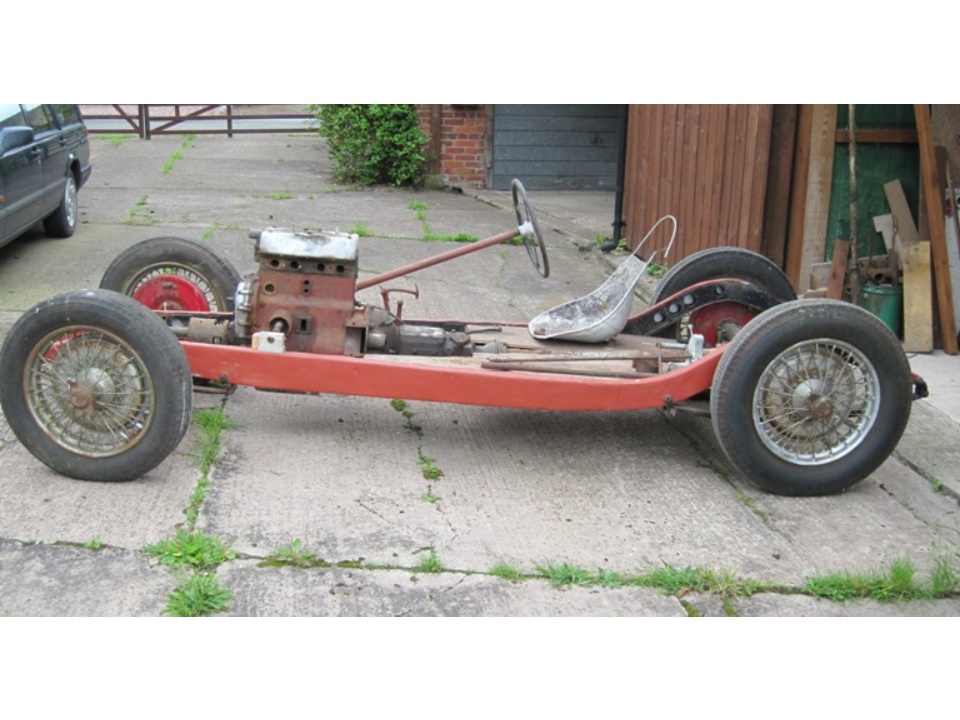 It has a shortened Riley Falcon chassis with engine & gearbox moved back. All major components are from a 1936 Riley Falcon. The chassis has been substantially lightened. Engine spec is rebuilt to a race as follows: New Arrow con rods and shell big end bearings. The original, crack detected crank, high compression Omega pistons, modified camshafts, (better than Sprite spec), lightened flywheel with no clutch, polished & ported head, 4 branch tubular exhaust manifold, twin SU`s, belt driven water pump and dynamo, full flow oil filter system.