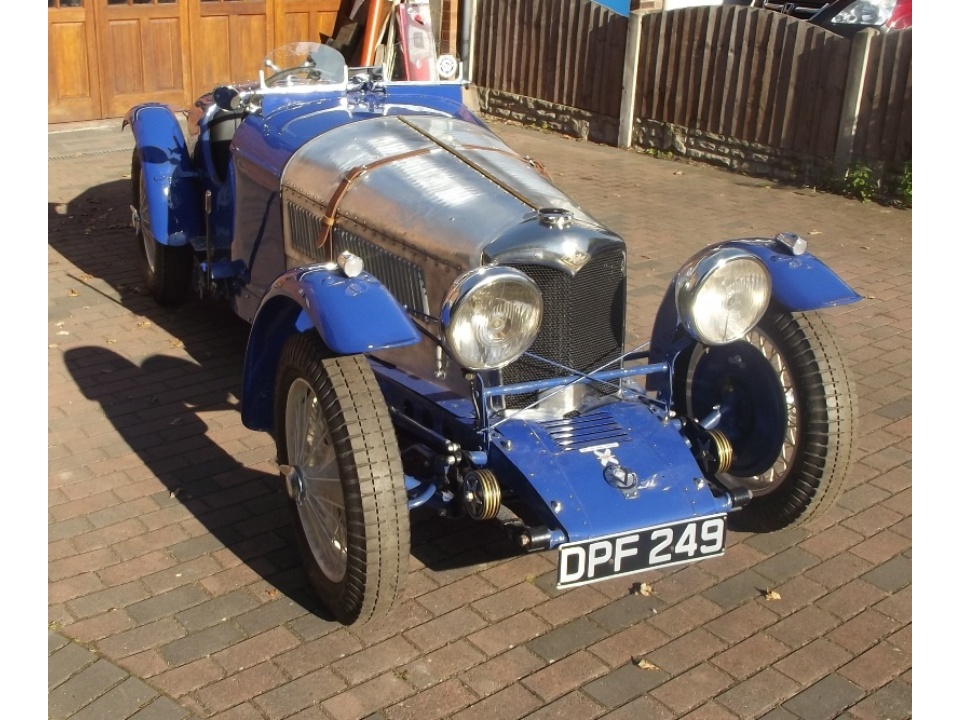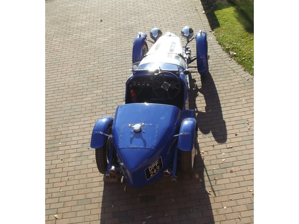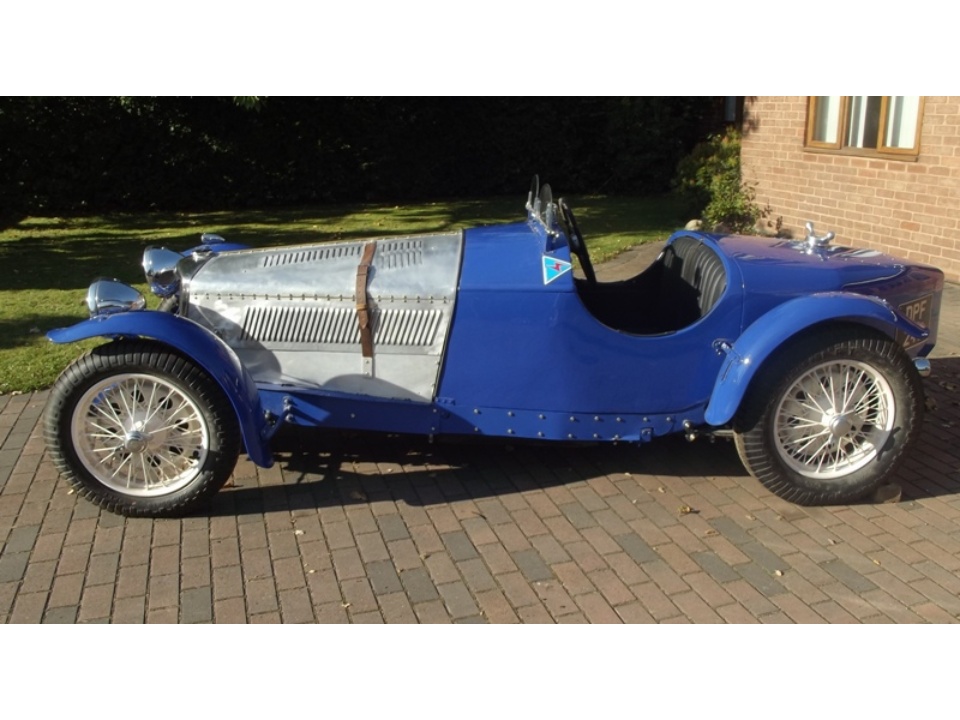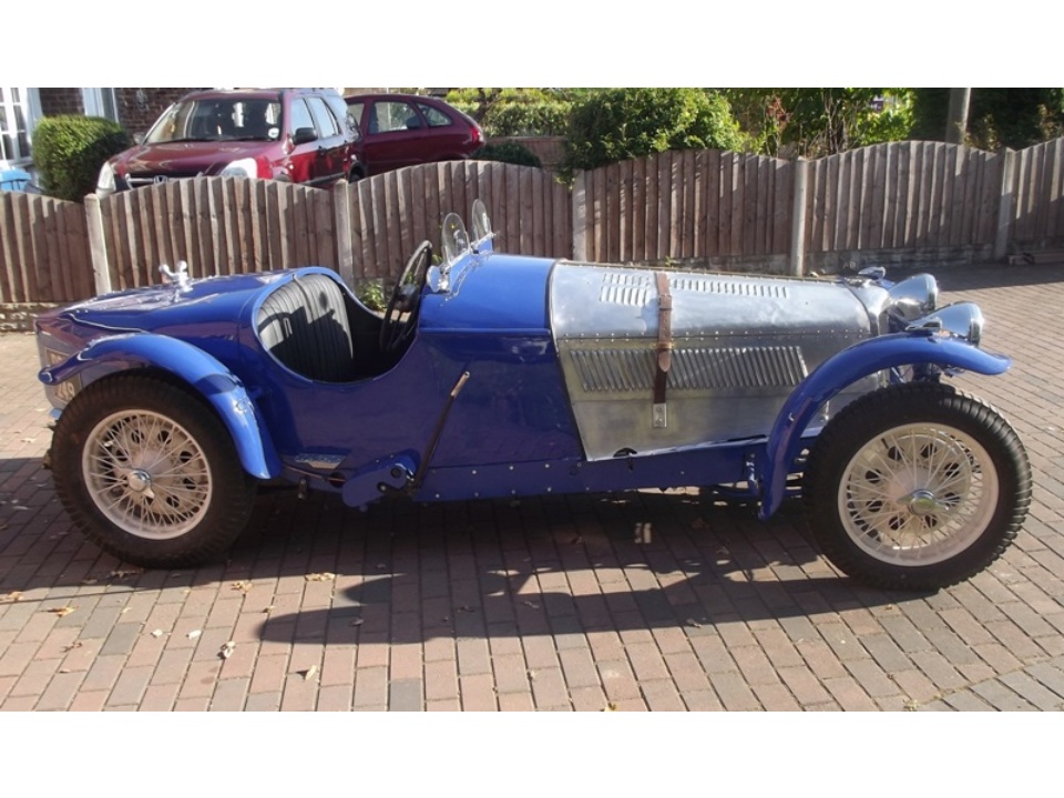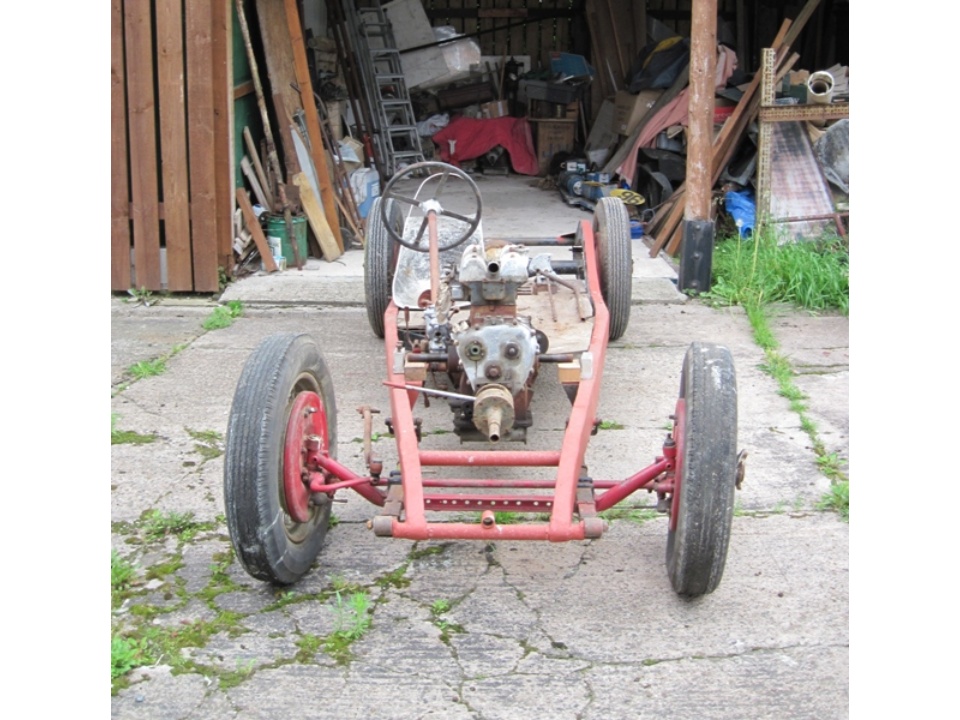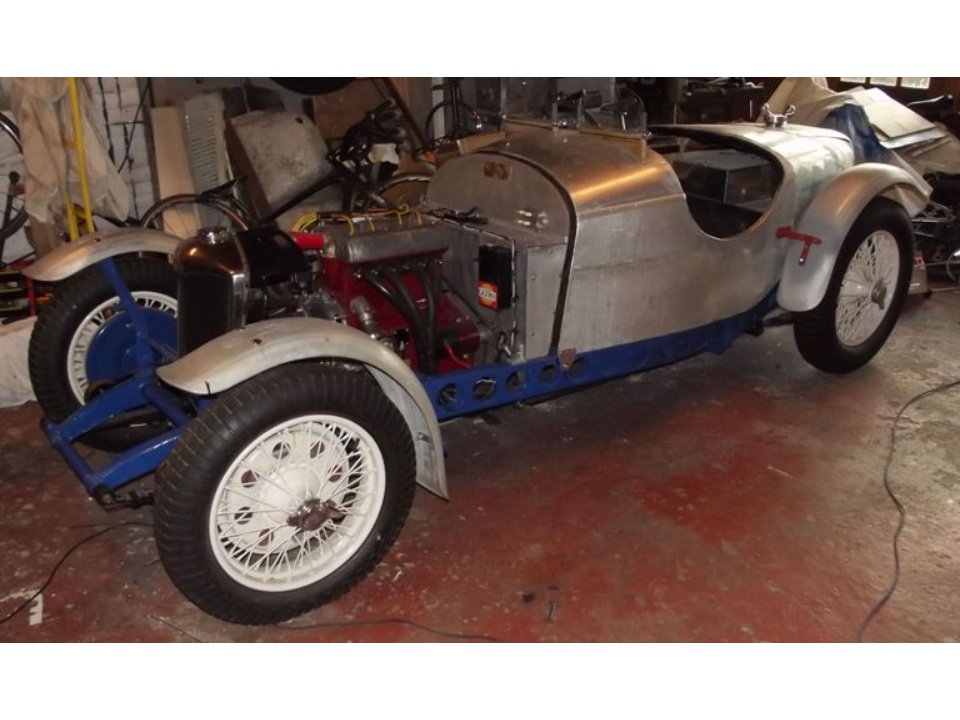 It has a shortened Riley Falcon chassis with engine & gearbox moved back. All major components are from a 1936 Riley Falcon. The chassis has been substantially lightened. Engine spec is rebuilt to a race as follows: New Arrow con rods and shell big end bearings. The original, crack detected crank, high compression Omega pistons, modified camshafts, (better than Sprite spec), lightened flywheel with no clutch, polished & ported head, 4 branch tubular exhaust manifold, twin SU`s, belt driven water pump and dynamo, full flow oil filter system.