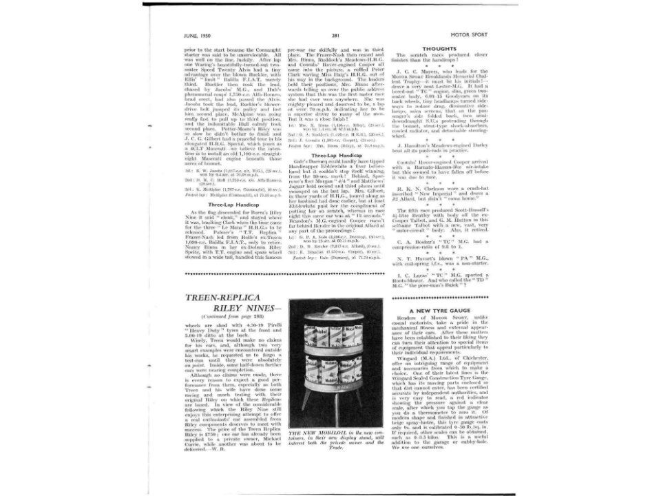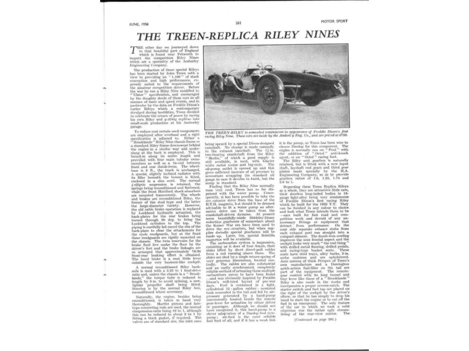 Der Riley (VC485) ist das Works Team Car von Treen. Dieses Fahrzeug wurde von John & Mary Treen aufgebaut und lange Zeit gefahren. Der angebotenen Treen hat FIA Papiere und das VSCC „BUFF“. Er wurde seit den 50er Jahren eingesetzt für Bergrennen und Rundstrecke.