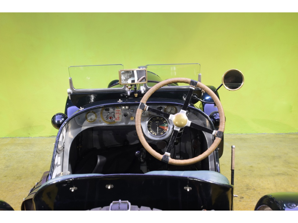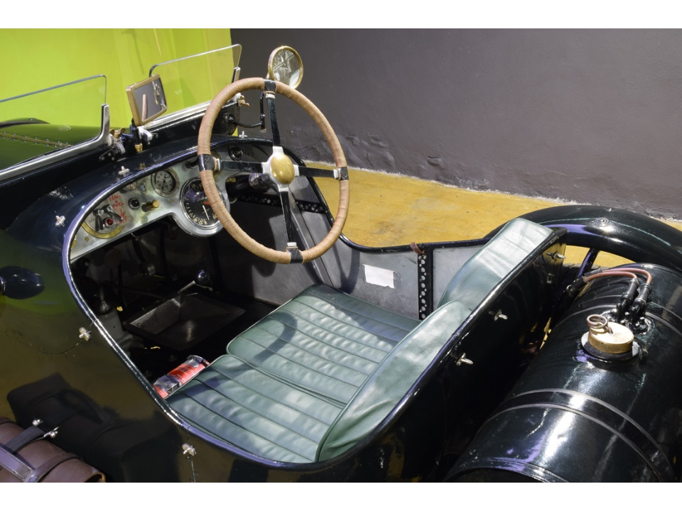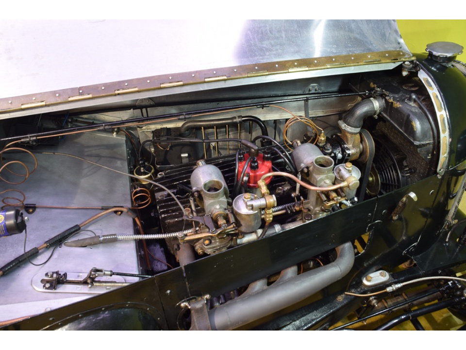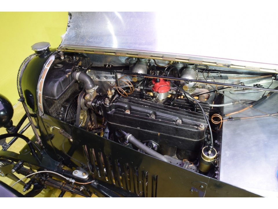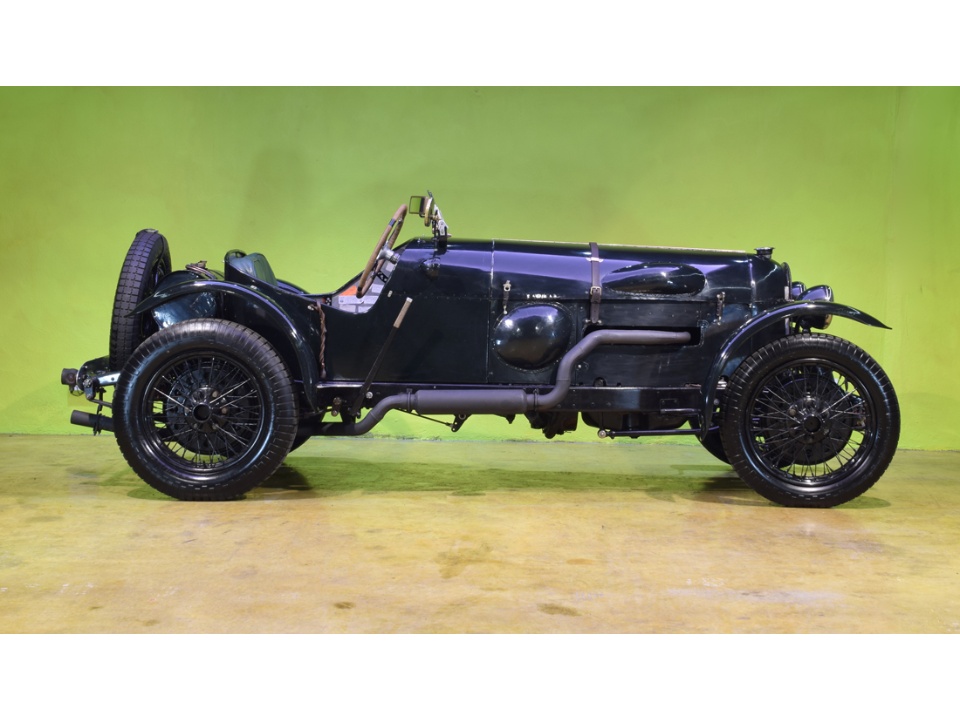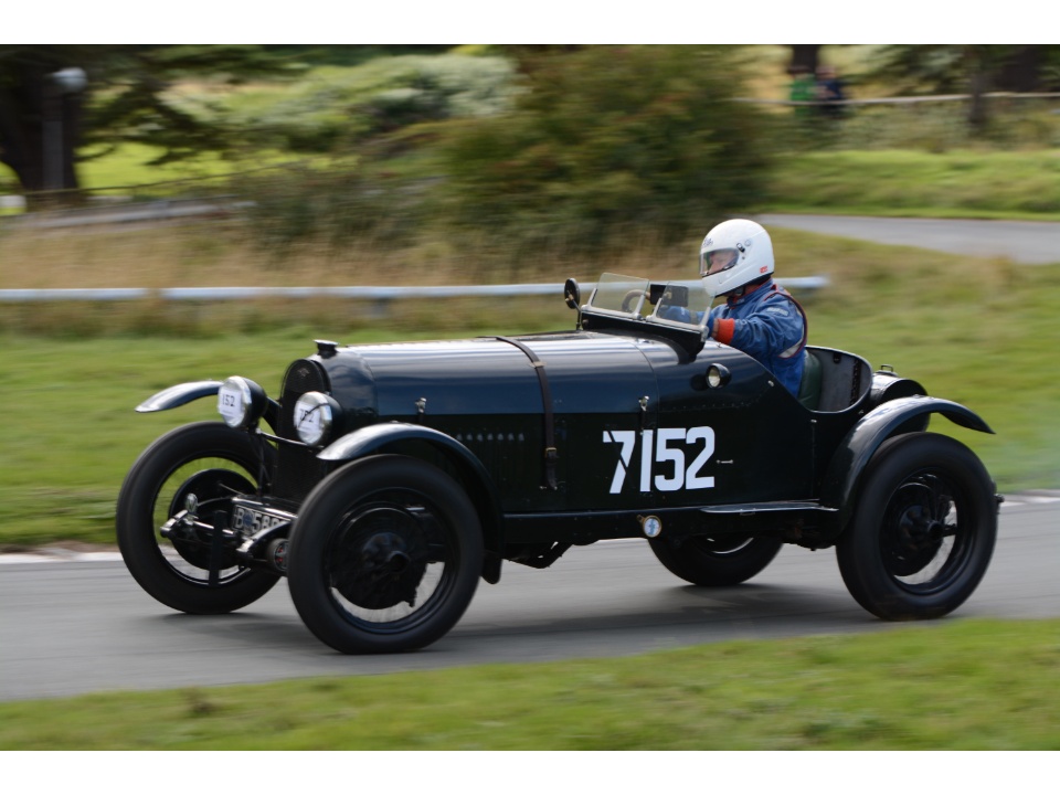 weitere Informationen/more info | The History: This is one of four cars specially developed for competition work just before and after the Second World War by the late John Garden of Inverurie, who was well known in Scottish Riley circles. It is based on a Riley and is listed by chassis number in David Styles Riley history of 1982 ‘As Old as the Industry’ as the ‘Garden Special’ when it was not then registered for road use. It is also listed in the records of the Riley Register as a ‘Garden Special’ It has been in Scotland for most of its life and has had very few owners. From John Garden it went to a Mr. Foster near Leuchars thence to a Dr. Richardson Kirkcaldy and then to Mr Peter Graham [of Forgandenny, Perth] by the time Peter acquired what remained of the Garden special, it was essentially the original chassis and axles. He meticulously re-built the car, installing the current engine, road registered it and undertaking a couple of debut competition appearances.The present owner acquired it in early 2013. Since then it has had three busy and successful seasons, achieving a number of awards and benefiting from additional mechanical and aesthetic refinements. The Car: The original 1929 Riley chassis and axles have been extensively developed to take the extra power of a tuned and balanced Ford model A engine. Rated at 3,300cc the model A engine has been upgraded to incorporate the highly desirable model B crank running on shell bearings with a full flow oil pump and filter. It is also fitted with a new 1929 type Thomas alloy cylinder head [cast using the original tooling] which raises compression and aids cooling. Twin downdraught SU’s, a sports camshaft, Mallory distributor and side exhaust all help the engine to achieve approx. 90BHP. There is potential for supercharging or fitting an OHV head or both. The rest of the engine is quite strong enough to take it and a supercharger will be provided with the car. A Ford close ratio 3 speed gearbox is mated to the original but adapted Riley torque tube rear axle. The rear axle ratio is currently 4.1, incorporating a strong 4 star diff carrier. This seems ideal for all round use in sprints, hillclimbs, trials and the open road, giving 20.5mph per 1000 rpm in top gear. 3.25 ratio previously fitted is also included with the car. Good for very fast road or racing work giving a top speed ratio of 25+ mph for every 1,000 rpm in top gear. Torque control rods and new multi disc Sprite type Hartford shock absorbers fitted to lightened front axle. 13inch brakes modified to hydro-mechanical front/rear by a tasteful and non intrusive conversion and an external mechanical handbrake operating on the hydro-mechanical brake cross shaft by rods to the rear brakes. The brake drums and back plates are machined for lightness and cooling. Gauze splashguards fitted to backplates. To Summarise: This handsome and fast vintage sports car is well proportioned having a wheelbase of 8ft. with a 4ft. track --and an all up weight of just 780kg. It is a well developed and sorted historic special with a nice patina of good use and maintenance and a big powerful vintage engine with great potential for relatively simple further tuning. Meticulously and tastefully put together with much fine period detail, including good quality vintage switchgear and instrumentation. There is ample room for even the tallest of drivers and the abundant torque from the 3.3 litre engine makes it a crisp and lively performer with agile handling on the road or track. It has new high quality leather seat squabs and mohair tonneau and the rear wheels have just been re-spoked and the oil and filter changed. Ready for immediate use and ideal for all VSCC disciplines. Currently with a VSCC Buff form eligibility document During the last three motoring seasons 2013,14, & 15 the Garden Special has competed at the following venues: VSCC Curborough Speed Trials Lakeland Trial VSCC/BARC Harewood Hillclimbs VSCC/MAC Shelsley Walsh Hillclimbs VSCC/BOC Prescott Hillclimbs VSCC Brooklands Double Twelve Speed Trials VSCC Oulton Park Autosolo VSCC Loton Park Hillclimbs Most recent awards:- Brooklands Double Twelve June 2015-- Speed Trials, 1st Vintage in class. Driving Tests, 3rd class award Prescott Hillclimb August 2015--1st Vintage in class |